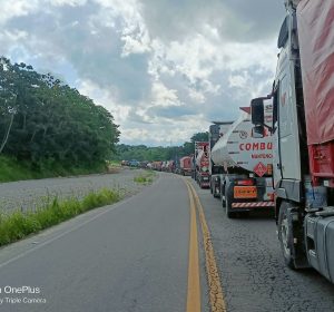 Wieder 50 km weiter beginnt sich die rechte Standspur des Highways kilometerlang mit LKWs zu stauen. Der Stau wird immer dichter und ich muss mich um die Trucks herumschlängeln, um vorwärts zu kommen. Ab und an auch über den Grünstreifen und die Botanik. Nach etwa 5 km kommt der Grund für den Stau: die Straße wurde von irgendwelchen Demonstranten beiderseits einer Brücke gesperrt. Mopeds lassen sie glücklicherweise durch, allerdings muss die Karre ausgemacht und über die Brücke geschoben werden. Mich als Ausländer lassen sie durch.