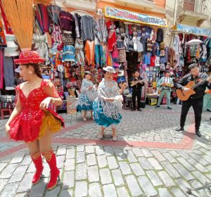 Das Sehenswerte sind die Menschen und die Kulturen. Nicht weit von meinem Hotel liegt die touristische "Witches"-Gasse. Dort reihen sich Souvenirgeschäfte massenweise aneinander. Und zu meiner Überraschung auch viele traditionell gekleidete, folkloristische Gruppen. Die spielen am heutigen Sonntag traditionelle bolivianische Musik mit Trommeln, Querflöten und Trompeten und ziehen alsbald durch die Stadt. Das hat so etwas von einem Faschingsumzug. Jedenfalls toll anzusehen.